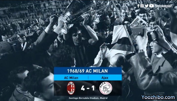 1968-1969赛季欧洲冠军杯决赛中西班牙马德里的伯纳乌球场上演,两大豪门AC米兰和阿贾克斯展开终极对决。这是红黑军团第三次闯入欧冠决赛,6年前名帅罗科带领AC米兰首夺欧冠冠军,这次罗科第二次指挥米兰杀入决赛。米歇尔斯执教、巨星克鲁伊夫领衔的阿贾克斯则是首次入围欧冠决赛。实力和经验更胜一筹的AC米兰以4比1大胜全攻全守打法的阿贾克斯,夺得了队史第二个欧冠冠军。