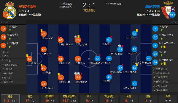 全场比赛皇马的控球率为59%,一共有17次射门,其中3次射正;奥萨苏纳一共有15次射门,其中5次射正。皇马面对奥萨苏纳的优势并不大,算是势均力敌。
