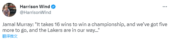 赛后,掘金球员贾马尔-穆雷接受了记者的采访。穆雷表示:“季后赛需要赢16场才能拿下总冠军,我们还需要再赢5场,而湖人正好挡道了。