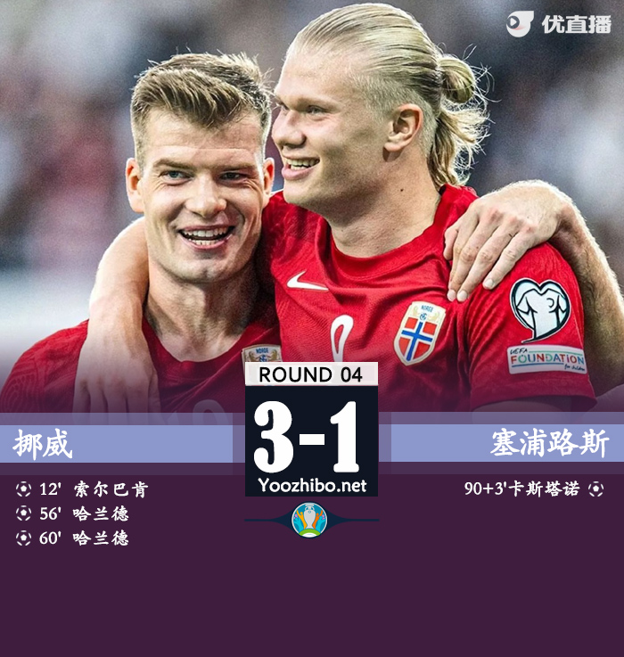 360直播讯 北京时间6月21日凌晨2点45分,欧洲杯预选赛小组赛第4轮展开一场较量,挪威主场对阵塞浦路斯。上半场,索尔洛特传中,索尔巴肯抽射打破僵局。下半场,哈兰德点射得分。随后,厄德高助攻哈兰德再下一城。读秒阶段,卡斯坦诺斯攻入安慰性进球。全场比赛结束,挪威3-1击败塞浦路斯,拿下本届欧洲杯预选赛首场胜利。