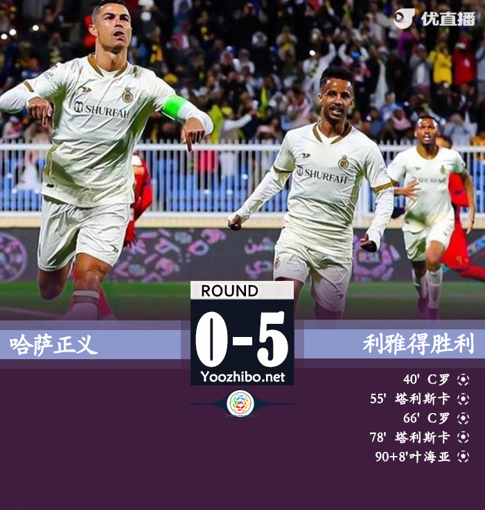 360直播讯 北京时间4月5日03:00,沙特联赛第22轮利雅得胜利挑战哈萨正义的比赛,上半场阿姆里造点,C罗点射破门,下半场塔利斯卡、C罗均完成双响,叶海亚补射建功,最终利雅得胜利客场5-0大胜哈萨正义。